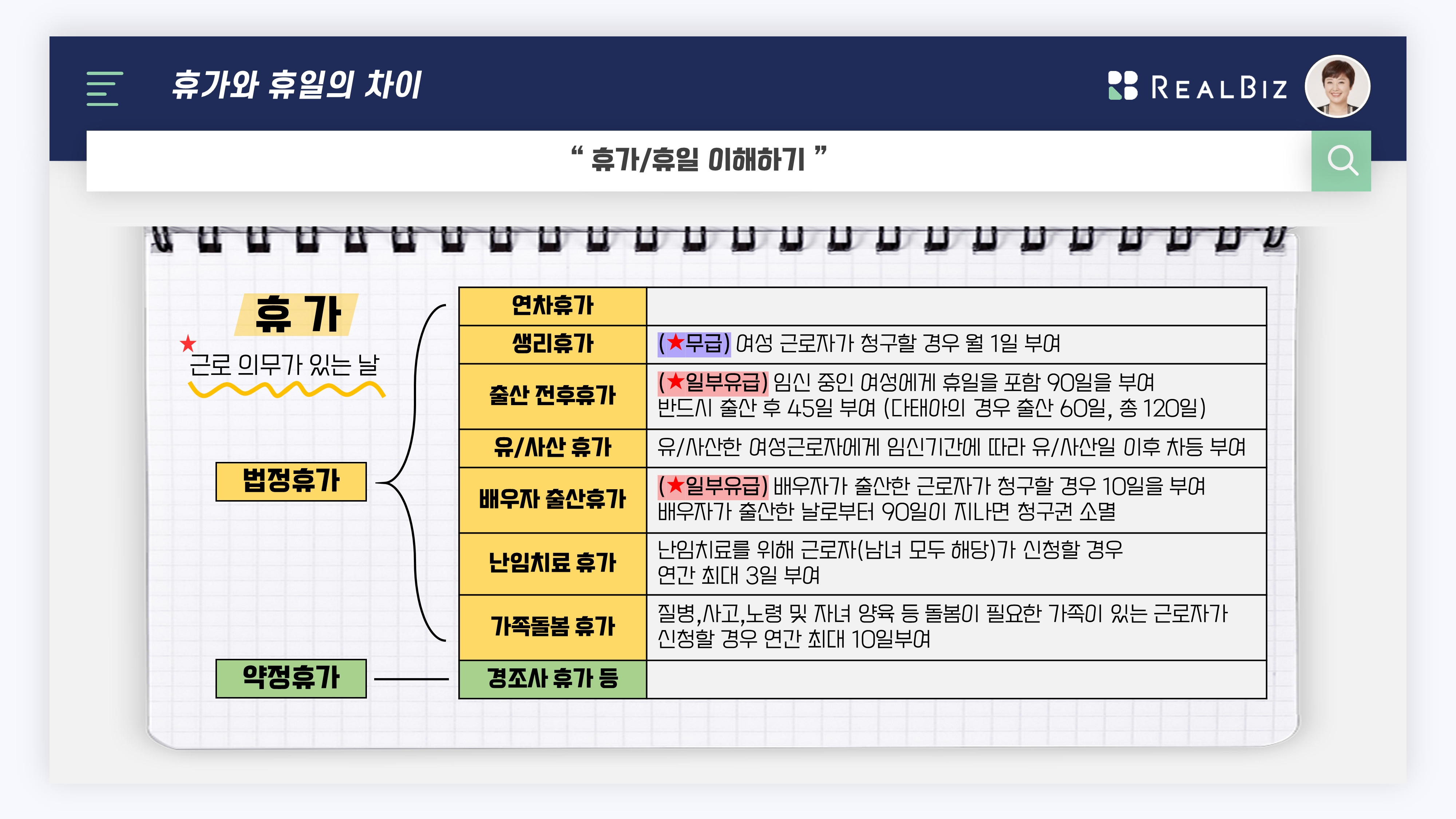 위의 이미지처럼 법정휴가는 연차휴가, 출산휴가 등 많은 휴가를 포함하고 있는데요.