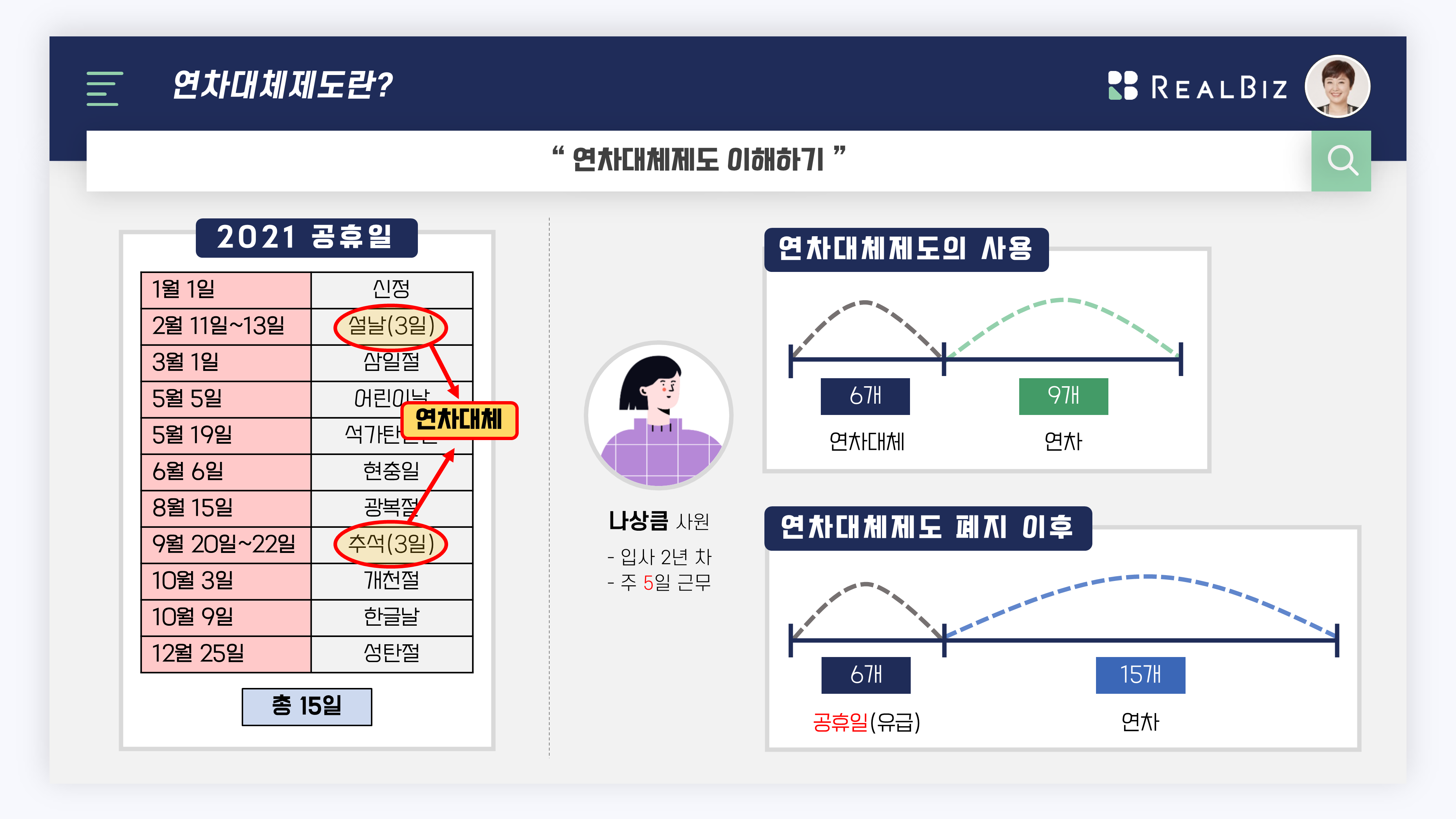 연차대체제도는 2021년 설명절 3일, 추석명절 3일을 쉬면서 연차대체를 소진하고,